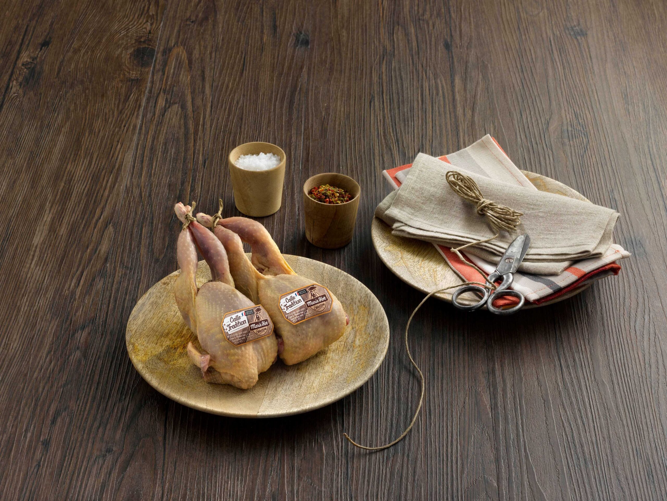 Grosse fleischige Wachteln von 240 g, aus einer langsam wachsenden Rasse stammend. Die Traditionswachteln wrden während 42 Tage aufgezogen. Diese Aufzuchtsmethode verleiht ihm ein festes Fleisch.
