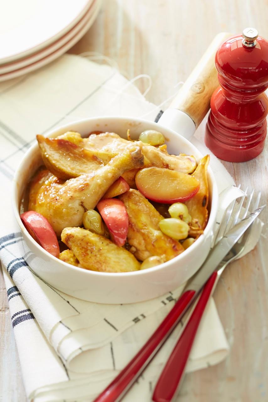 - Réservez le coquelet, faites réduire le jus de cuisson. Servez le coquelet nappé de sauce, accompagné des fruits et décoré de persil.